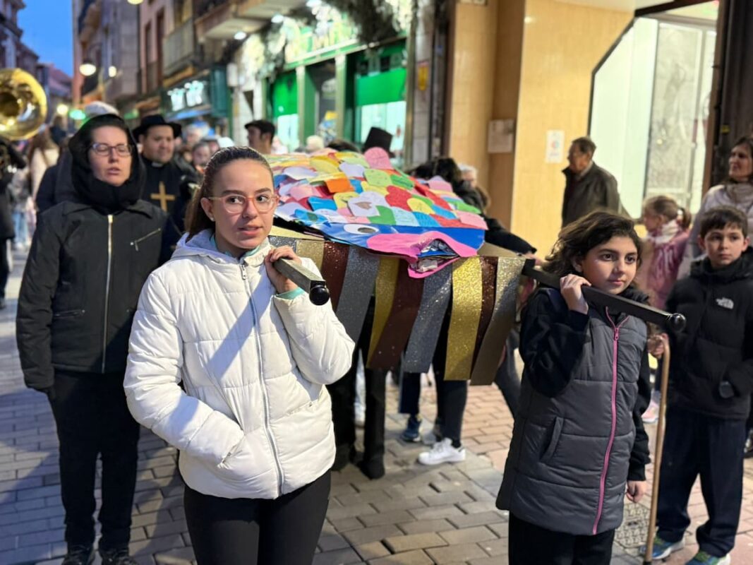 El pistoletazo de salida se dio a las 19:00 horas desde la Casa de la Cultura ‘La Encomienda’, donde la comitiva se concentró con la sardina protagonista —una gran figura de cartón elaborada en el taller infantil y juvenil del martes— presididiendo el cortejo. Vecinos de todas las edades, y varios ataviados con riguroso luto negro, acompañaron al féretro improvisado entre plañideras improvisadas, llantos y la charanga Los Chumachos que alternaba marchas fúnebres con toques irónicos y canciones más festivas.