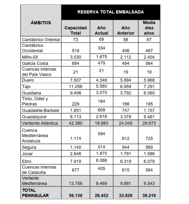 La situación de las cuencas, en hectómetros cúbicos, se detalla en el cuadro adjunto: