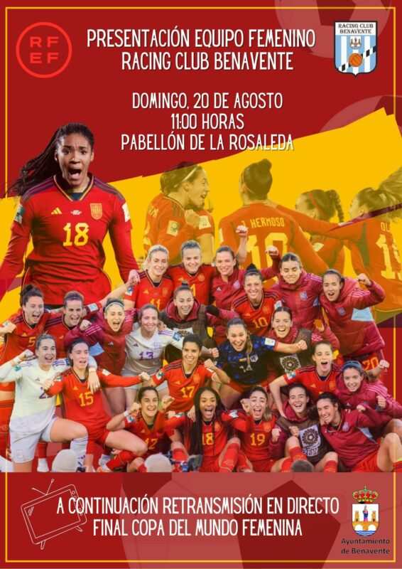 El pabellón de la Rosaleda acoge este domingo 20 de agosto la presentación del equipo femenino del Racing Benavente y coincidiendo con esta cita, la concejalía de Deportes organiza el visionado de la retransmisión de la final del Mundial Femenino 2023 en la que España se enfrenta a Inglaterra.