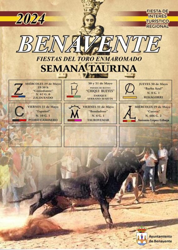 En este año 2024, la Semana Taurina de Benavente, por las calles de la villa de los condes duques, será «Cuerva» el astado que abra la primera tabla del abanico. El toro de la ganadería cacereña de Antonio López Gibaja servirá de heraldo a la gran cita del Día Grande con el astado, el Toro Enmaromado, de nombre «Comediante«, un ejemplar nacido en 2019 y con un peso de 558 kilos de la afamada ganadería cacereña Zalduendo con orígenes en 1722.