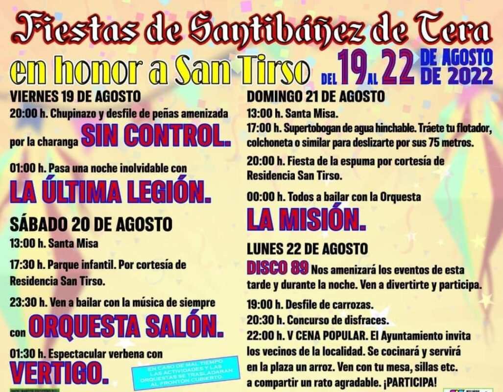 Santibáñez de Tera celebra desde el viernes 19 de agosto hasta el 22 de este mes los festejos en honor a San Tirso y lo hace por todo lo alto, con grupos musicales y orquestas de la talla de la Última Legión, la orquesta Salón, el grupo Vértigo, la orquesta La Misión y como clausura de festejos Disco 89.