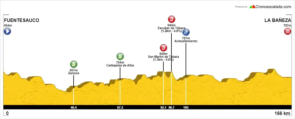 En Tábara se repartirán más puntos de los sprints especiales (km 102,3). Será importante ver cómo viaja por este punto la carrera y si algún hombre de la general haya podido intentar una gesta de lejos. Lo cierto es que por delante aún quedará mucho terreno hasta La Bañeza, adentrándose la carrera en suelo leonés tras cruzar antes Camarzana de Tera, Santibáñez de Vidriales y Fuente Encalada.