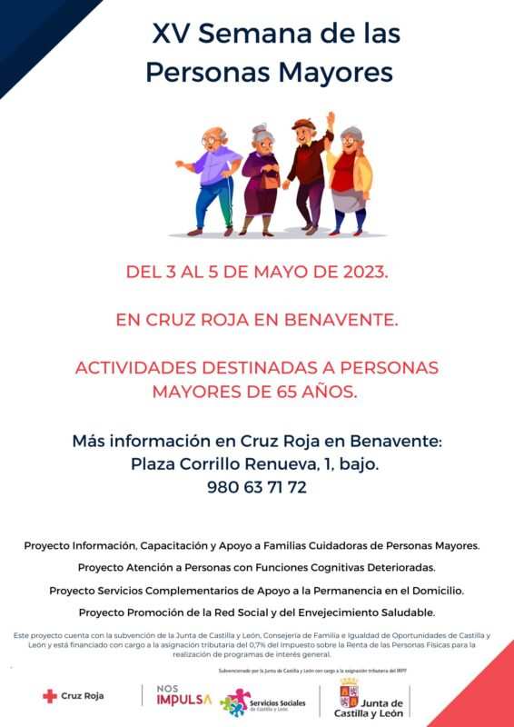 La XV Semana de las Personas Mayores en Benavente, que se desarrollará entre el 3 y el 5 de mayo, comenzará el próximo miércoles a las 17:00 horas, con la presencia de Inés Mateos Mateos, presidenta comarcal de Cruz Roja en Benavente, y representantes de instituciones públicas.