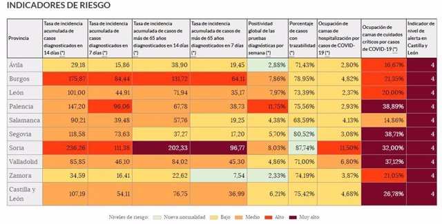 Las nueve provincias de Castilla y León se encuentran por debajo del nivel de riesgo ‘muy alto’ en los indicadores de incidencia acumulada tanto a 7 y a 14 días por primera vez desde que la Junta ofrece los datos, al bajar Soria este viernes de los 250 casos por 100.000 habitantes en los últimos 14 días –236–.