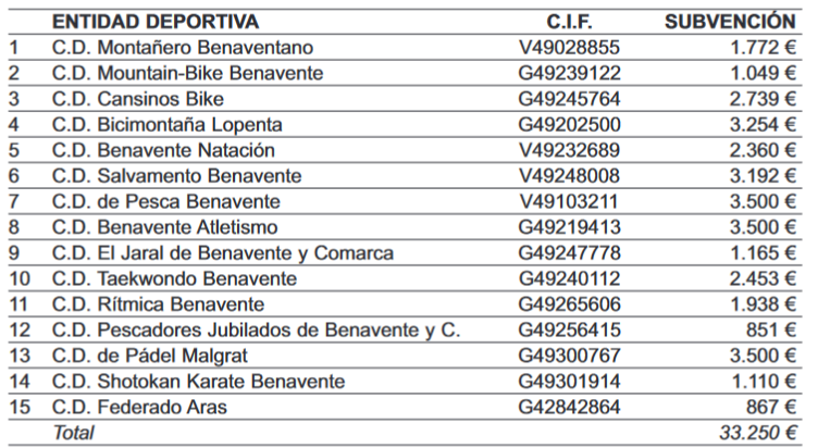 Un total de 15 entidades deportivas de la ciudad de Benavente reciben 33.250 euros del Ayuntamiento para la realización y participación en actividades deportivas durante el año 2023. Así se desprende de la Resolución publicada hoy en el Boletín de la Provincia.