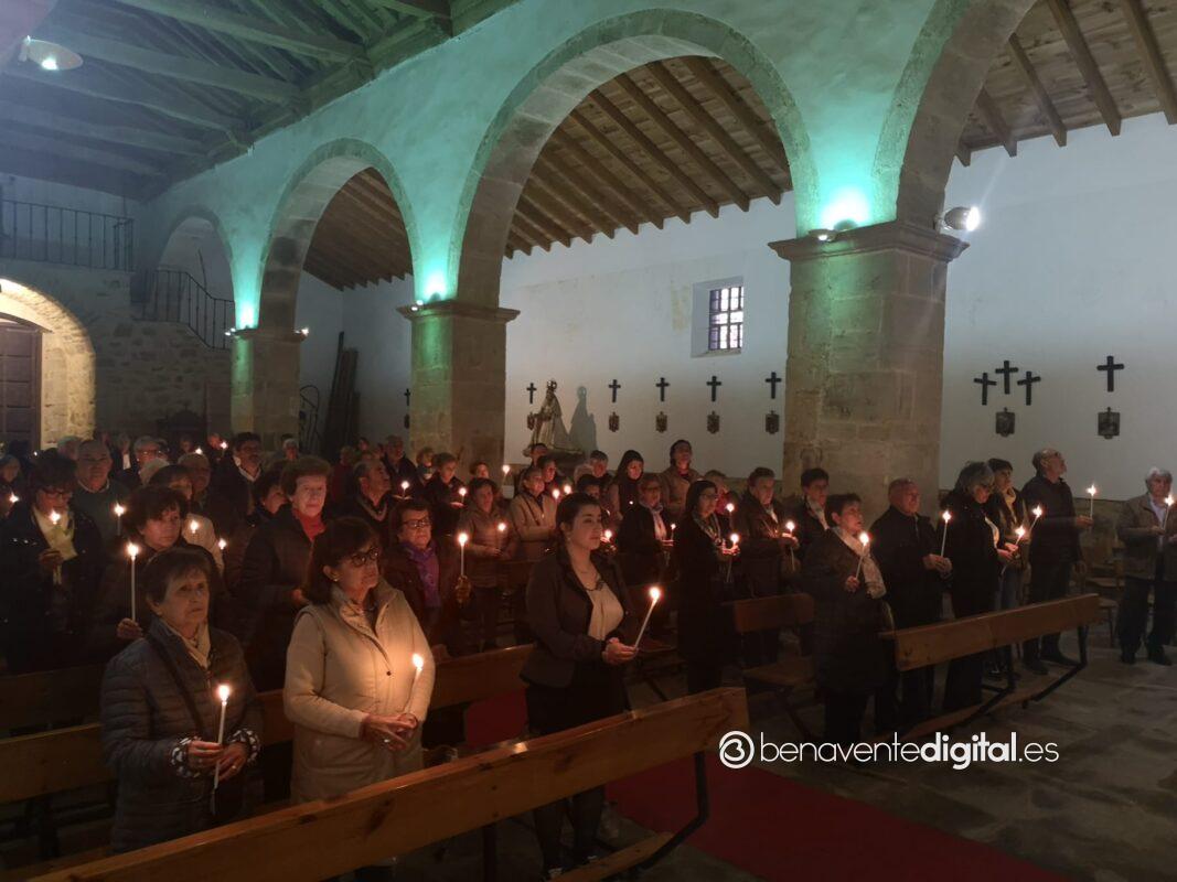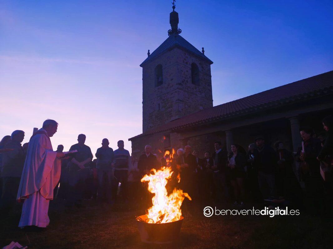 Numerosos vidrialeses celebraron esta noche la Vigilia Pascual en el santuario de la patrona del Valle de Vidriales. El templo mariano de la Virgen del Campo, en Rosinos, acogió la fiesta litúrgica más importante de la Iglesia, la de la Resurrección. Al grito de: ¡Resucitó, resucitó, resucitó. Aleluya, aleluya, aleluya!, los vidrialeses llegados desde diferentes localidades de la zona participaron en la celebración abierta con el rito del fuego.