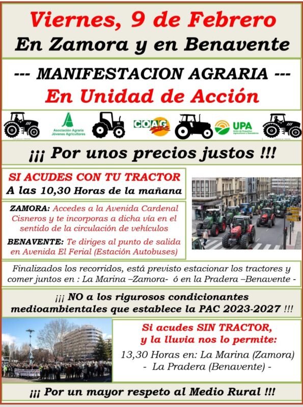 Los sindicatos agrarios Asaja, Coag y Upa han convocado para este viernes 9 de febrero una manifestación en Banavente y otra en Zamora.