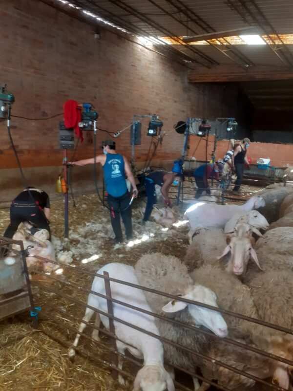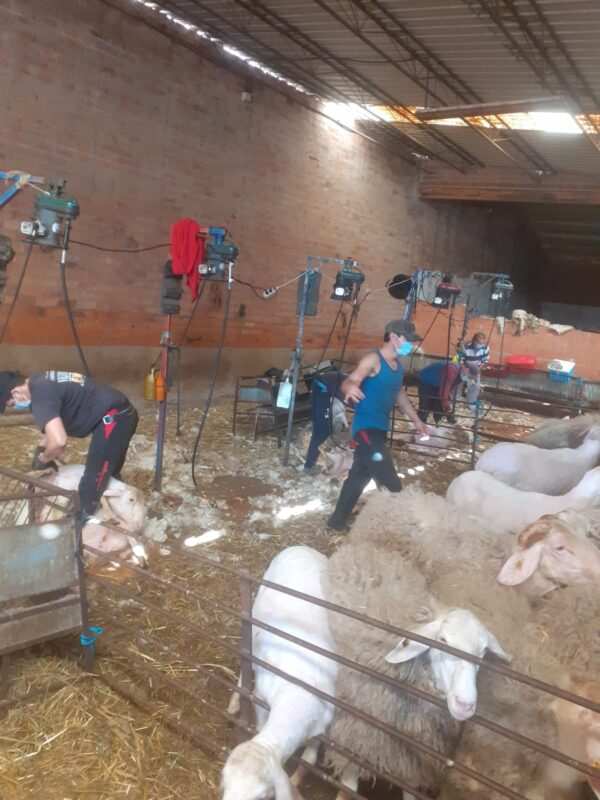 El millar de rumiantes de raza assaf pasa por la peluquería entre cancillas con una inquietud propia de estos animales. Expectantes, se arremolinan entre las vallas. Y es que las ovejas también han de guardar cola a la espera que la brigada de esquiladores lleve a cabo su labor, la del «maneo», la del «esquileo» y la del «desmaneo». Se trata de colocar, con mimo y destreza, a cada oveja en la plataforma para que la cuchilla eléctrica retire su cobertura lanuda. En sólo dos minutos o poco más, y con el mejor bienestar posible, la oveja está guapa, se siente más fresca porque se ha quitado todo un peso de encima y muestra su agradecimiento con su baleo desfilando por la pasarela del redil tras su paso por la peluquería.
