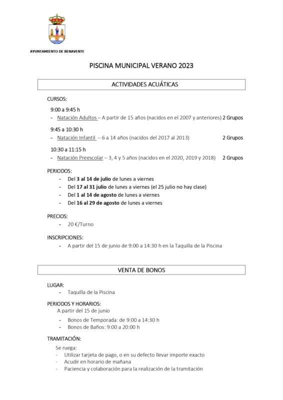 Los usuarios de la instalación podrán adquirir abonos de temporada en las taquillas de la instalación a partir del 15 de junio e informarse de los cursos de natación tanto para adultos, infantil y preescolar, que comenzarán a partir del 3 de julio.