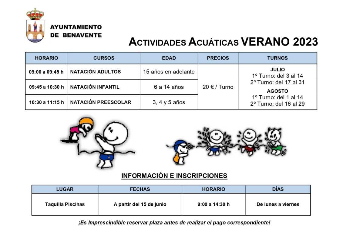 Los cursos de natación para adultos están dirigidos a personas mayores de 15 años que se realizarán de 09:00 a 09:45 horas. Los cursos de natación infantil serán para jóvenes de entre 6 a 14 años en horario de 09:45 a 10:30 horas mientras que los cursos de natación preescolar dirigidos para niños y niñas de 3, 4 y 5 años comenzarán a las 10:30 horas y finalizarán a las 11:15 horas.