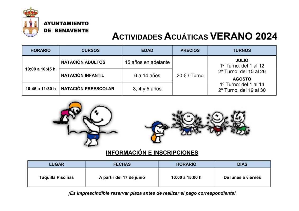 Además de los cursos y las entradas de día, los usuarios de la piscina podrán adquirir bonos de baño o bonos de temporada en la taquilla de la instalación a partir del día de hoy. Igualmente, la información y las inscripciones de los cursos de natación deberán realizarse en la taquilla de la piscina municipal desde el 17 de junio en horario de diez de la mañana a tres de la tarde de lunes a viernes.