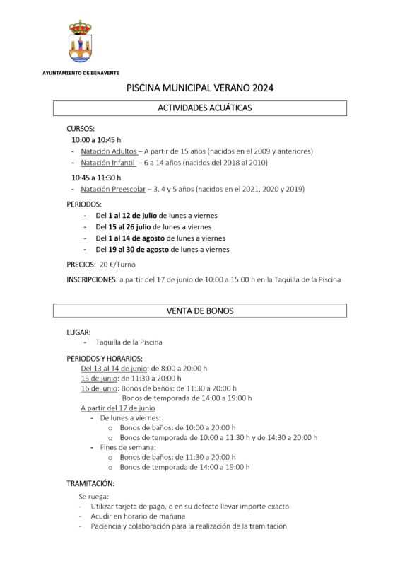 La Junta de Gobierno Local del Ayuntamiento de Benavente, celebrada este miércoles, aprobó la propuesta de la Concejalía de Deportes con los precios públicos de las piscinas municipales y de las actividades acuáticas, manteniendo similares precios que en la pasada temporada. Desde el próximo sábado 15 de junio se abren las instalaciones municipales para el desarrollo de la temporada estival con una jornada de puertas abiertas.