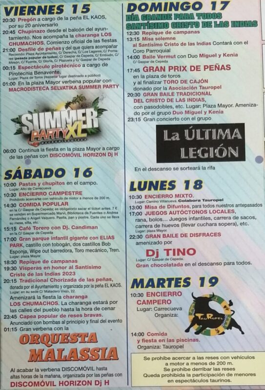 El abanico de actos extiende sus tablas durante estos días con verbenas durante todas las noches y madrugadas, encierros y capeas, comidas populares, juegos autóctonos, atracciones infantiles, desfiles, el Grand Prix de peñas y las celebraciones religiosas en honor al muy venerado Santísimo Cristo de las Indias.