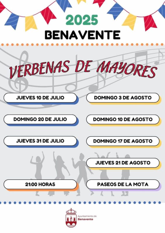Este jueves 10 de julio comienzan las esperadas Verbenas de Mayores 2025 en Benavente, un evento que promete llenar de música, alegría y convivencia los Paseos de la Mota. Organizadas por el Ayuntamiento de Benavente, estas verbenas se celebrarán todos los jueves y domingos en distintas fechas de julio y agosto, siempre a partir de las 21:00 horas.
