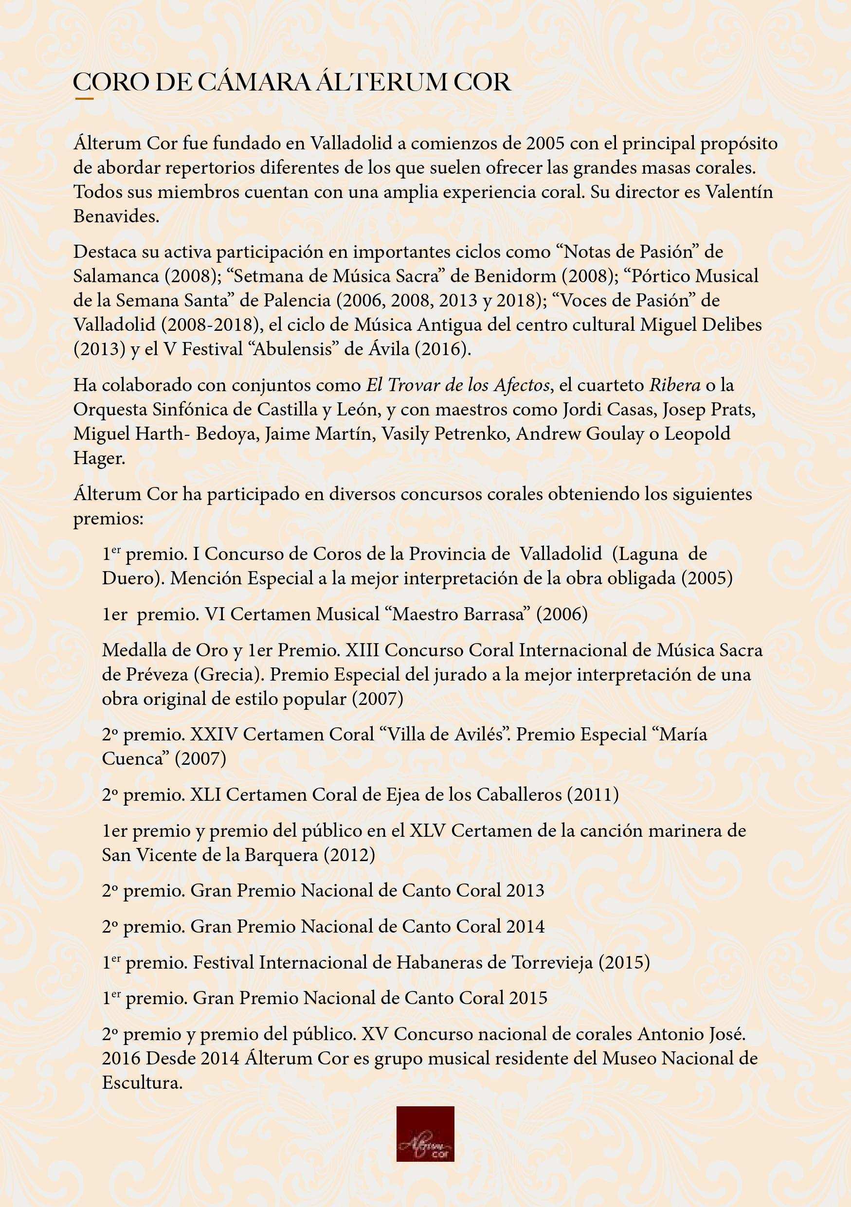 Alterum Cor fue fundado en Valladolid a comienzos de 2005 con el principal propósito de abordar repertorios diferentes de los que suelen ofrecer las grandes masas corales. Todos sus miembros cuentan con una amplia experiencia coral. Su director es Valentín Benavides.
