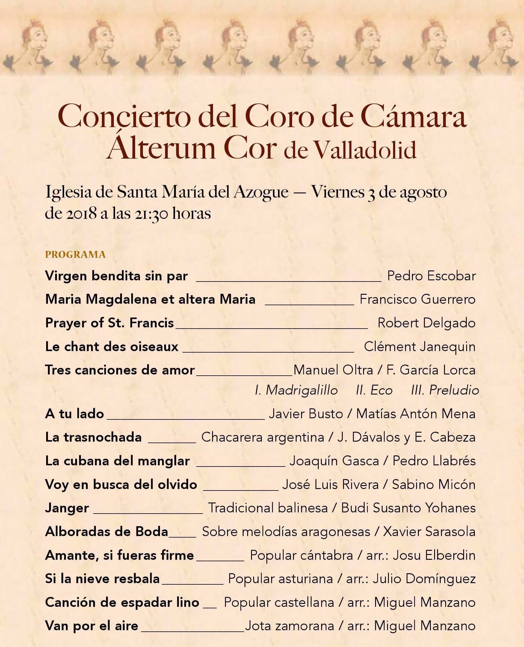 El Centro de Estudios Benaventanos «Ledo del Pozo» ha organizado para el próximo viernes 3 de agosto a las 21.30 horas en La Iglesia Santa María del Azogue, concierto de la Coral ÁLTERUM COR de Valladolid.