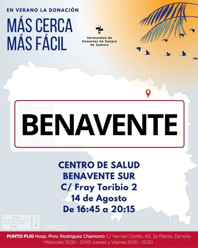 Durante la próxima semana, la Hermandad de Donantes de Sangre de Zamora intensificará su campaña de verano, acercando la posibilidad de donar sangre a diversas localidades de la provincia, incluyendo Benavente. Con el lema «En verano la donación, más cerca, más fácil», se busca sensibilizar a la población sobre la importancia de donar sangre, especialmente en estos meses donde las donaciones tienden a disminuir.
