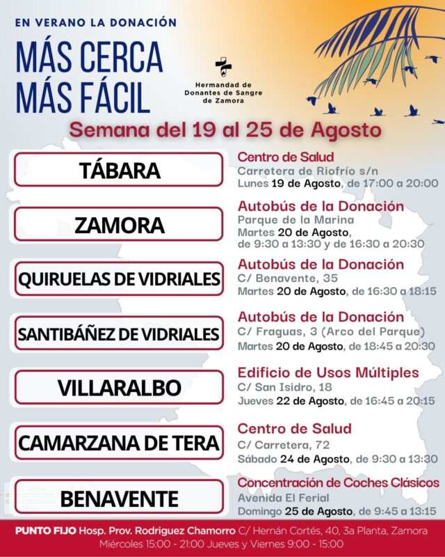 - Martes 20 de agosto: La capital provincial, Zamora, contará con el Autobús de la Donación en el Parque de la Marina, disponible de 9:30 a 13:30 y de 16:30 a 20:30 horas. Además, el autobús se desplazará a Quiruelas de Vidriales (C/ Benavente, 35) de 16:30 a 18:15, y luego a Santibáñez de Vidriales (C/ Fraguas, 3 – Arco del Parque) de 18:45 a 20:30.
