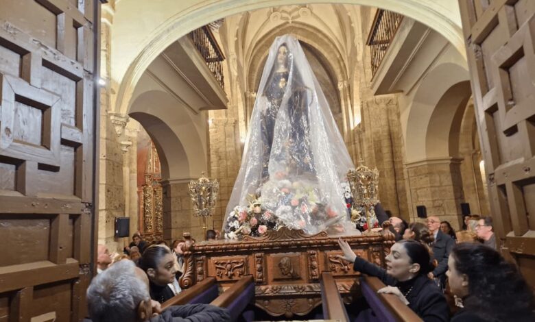 El atrio de la Puerta Oeste de la iglesia de Santa María La Mayor cobró en la noche de este Viernes de Dolores una estampa singular que pasará a los anales de la historia de la Semana Santa de Benavente. Tras medio siglo cruzaba las puertas la imagen de Nuestra Señora la Virgen Dolorosa. Y lo hacía tímidamente, cubierta de plástico para resguardecerse de la lluvia.