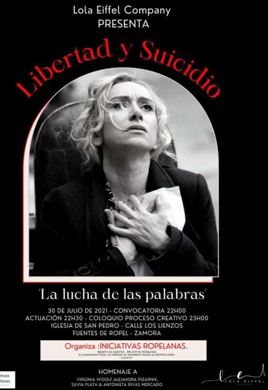 Ya en el viernes 30 de julio, a las 22:00 horas, se organiza en el pórtico de la iglesia la segunda sesión de la miniferia literaria con la participación de los autores Dimas Vaquero y Fernando Pernía Vega. La actuación de la artista descendiente de Fuentes de Ropel, Lola Eiffel, considerada como referente de danza contemporánea en Castilla y León, servirá de deleite para los vecinos con la obra «Libertad y Suicidio. La lucha de las palabras». Todo un homenaje a Virginia Woolf, Alejandra Pizarnik y Silvia Plath&Antonieta Rivas Mercado.