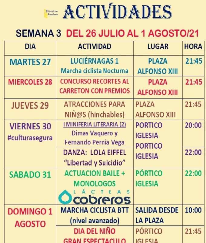 Las tablas del abanico de actos de la semana se cierran el sábado 31 de julio con una noche de humor y espectáculo de baile con niños de la ludoteca, dirigidos por Leire Magaz, en el pórtico de la iglesia de la calle los Lienzos. El monologuista Johnny N. San Miguel se encargará de que las risas de los asistentes llenen la plaza. Para el domingo, primer día de agosto, este escenario del pórtico de la iglesia acogerá una actuación de humor, risas y Rock& Roll en el Día del Niño dedicado por la asociación cultural. Previamente y a partir de las diez de la mañana se organiza la IV Ruta BTT Fuentes de Ropel con un itinerario de 36 kilómetros libres.