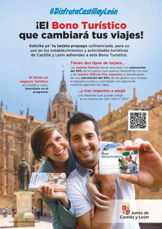 El Boletín Oficial de Castilla y Leon publica hoy la convocatoria de la Consejería de Cultura y Turismo para solicitar los bonos turísticos #DisfrutaCastillayLeón2021, que podrán solicitarse a partir de mañana jueves 30 de septiembre. Esta tarjeta prepago de carácter personal e intransferible, estará cofinanciada entre el solicitante y la Junta y el plazo para realizar el gasto abarca hasta el 31 de mayo de 2022.