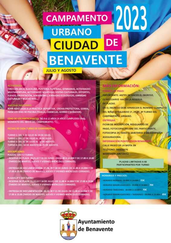 El Ayuntamiento de Benavente pone en marcha un año más el Campamento Urbano Ciudad de Benavente para los meses de julio y de agosto, con el fin de que las familias concilien y las pequeñas y los pequeños se diviertan y aprendan.