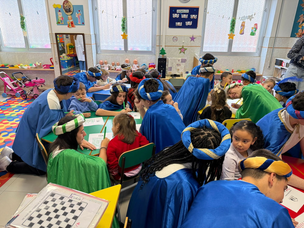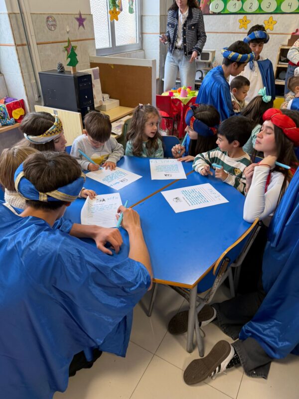 Los Pajes, elegantemente ataviados, llegaron con una misión muy especial: ayudar a los niños a escribir sus cartas para Sus Majestades los Reyes Magos. Con una sonrisa cálida y cercanía, recorrieron las aulas, guiando a los pequeños para que sus deseos llegaran de manera clara al buzón mágico.