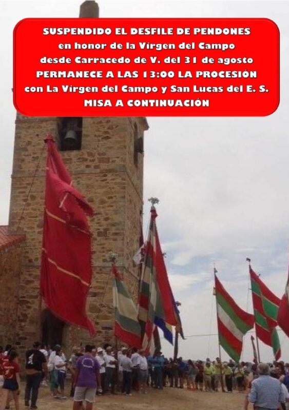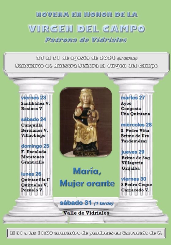 No obstante, la jornada romera se lleva a cabo, a partir de las 13:00 horas, con la procesión por la explanada del templo mariano con la imagen de la Virgen del Campo y el copatrón del Valle de Vidriales, San Lucas del Espíritu Santo. Una solemne misa clausurará los actos que se vienen celebrando desde el pasado viernes 23 de agosto con el oficio de un novenario con celebraciones eucarísticas, a las 20:00 horas, dedicadas a los pueblos vidrialeses.