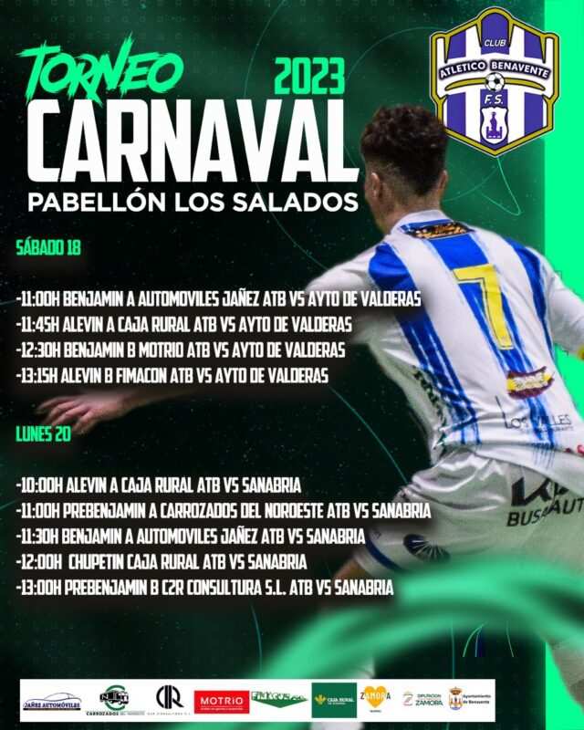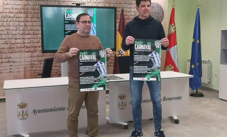 El tradicional Torneo de Carnaval de Fútbol Sala se disputará en horario de mañana este sábado 18 de febrero y el lunes día 20 en el Pabellón Los Salados de Benavente. La presentación del Torneo se hacía esta mañana de la mano del concejal de Deportes, Fernando Marcos, y del presidente del club Atlético Benavente Fútbol Sala, Álvaro Arias.
