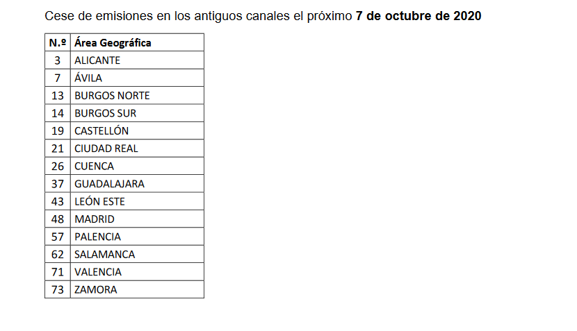 Los próximos días 1, 7 y 14 de octubre se producirá, en 5.019 municipios incluidos en 38 áreas geográficas de las 75 establecidas en el Plan Técnico Nacional de la Televisión Digital Terrestre, el cese de emisiones de algunos canales en sus antiguas frecuencias de la TDT y solo se podrán seguir viendo por las nuevas.