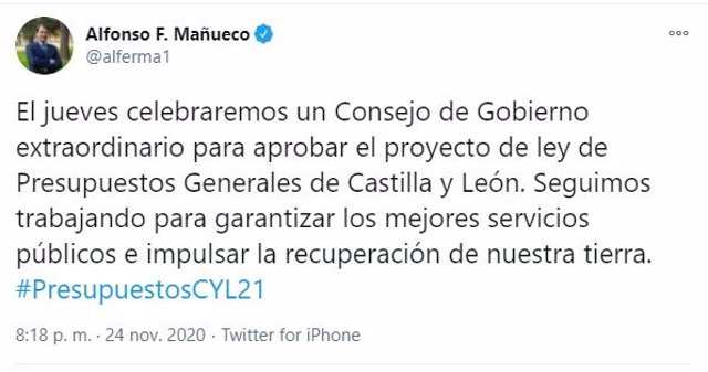 Aunque el vicepresidente y portavoz de la Junta, Francisco Igea, ya apuntó el pasado jueves que el proyecto de presupuestos de la Comunidad se conocería esta semana ha sido el jefe del Ejecutivo autonómico, Alfonso Fernández Mañueco, el encargado de confirmar la fecha a través de un mensaje en su cuenta de Twitter en la que informó de la celebración de un Consejo de Gobierno extraordinario el jueves 26 para aprobar el proyecto de ley de Presupuestos Generales de Castilla y León.