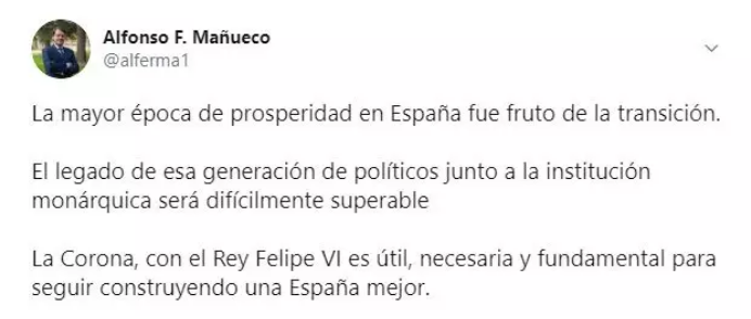 En el tuit de Alfonso Fernández Mañueco se puede leer: «La mayor época de prosperidad de España fue fruto de la Transición. El legado de esa generación de políticos junto a la institución monárquica será difícilmente superable».
