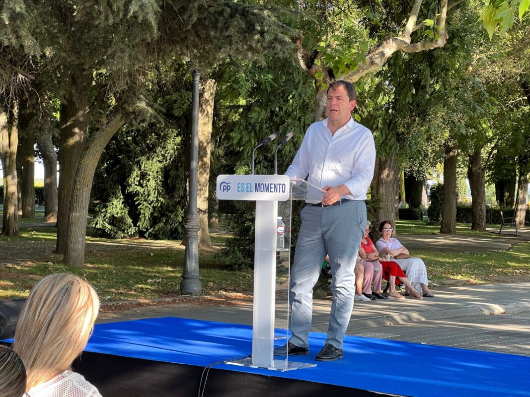 “Todo lo que no sea votar a Alberto Núñez Feijóo, es perpetuar el retraso en las infraestructuras que sufrimos en Castilla y León”, advierte el dirigente popular esta tarde en un acto electoral en el Paseo de la Mota.