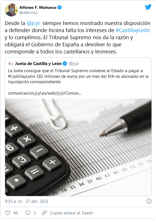 Lo hizo a través de su cuenta de Twitter, donde precisa que desde la Junta “siempre” se ha mostrado su disposición a defender “donde hiciera falta los intereses de Castilla y León”. “Y lo cumplimos”. “El Tribunal Supremo nos da la razón y obligará al Gobierno de España a devolver lo que corresponde a todos los castellanos y leoneses”, añade.