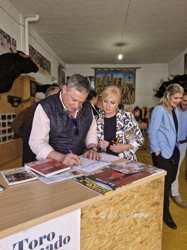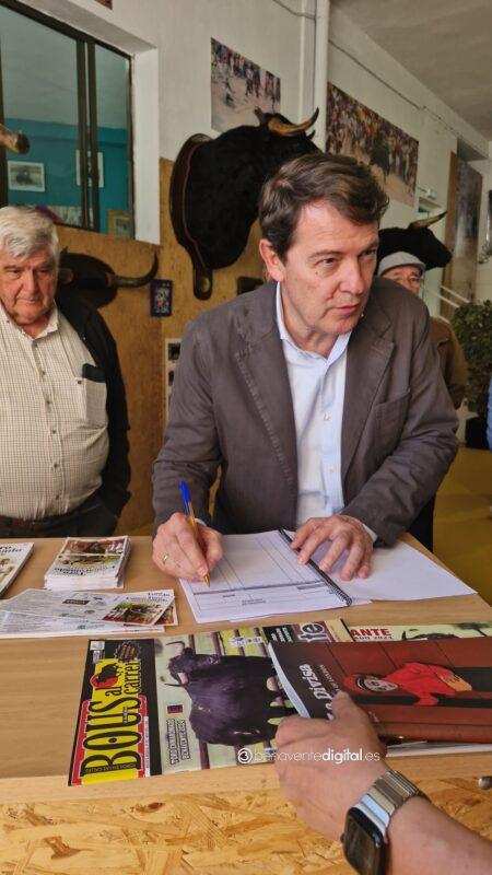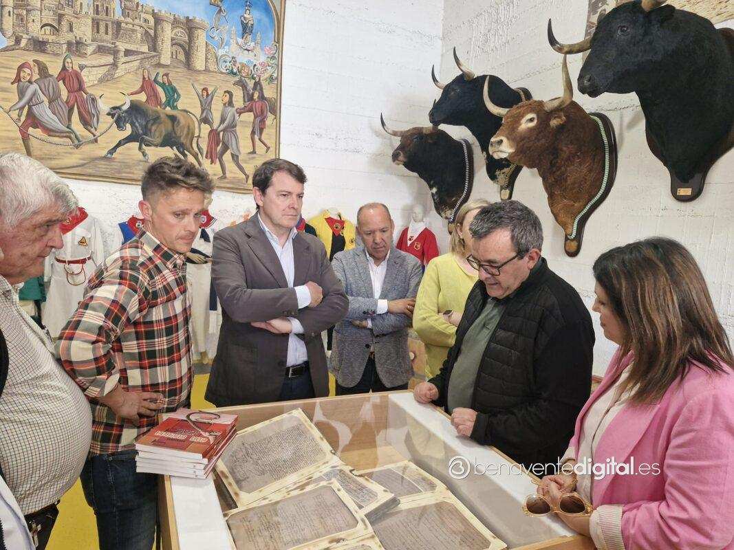 El recorrido continuó hasta la nueva exposición del Toro Enmaromado, ubicada en el antiguo Parque de Bomberos, anexo a la zona del Toril. Este museo, dedicado a la fiesta más importantes de Benavente, fue inaugurado simbólicamente con la firma de Mañueco en el libro de visitas como primer visitante oficial. Acompañado por el concejal de Fiestas, Alberto Lorenzo, y el archivero municipal, Juan Carlos de la Mata, el presidente recibió una visita guiada que incluyó una detallada explicación sobre la historia y las tradiciones del Toro Enmaromado.