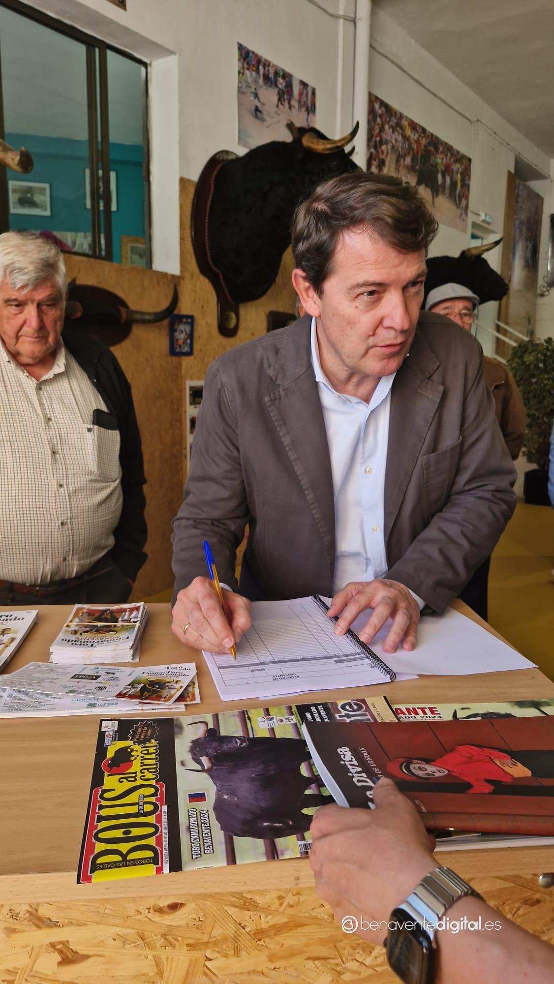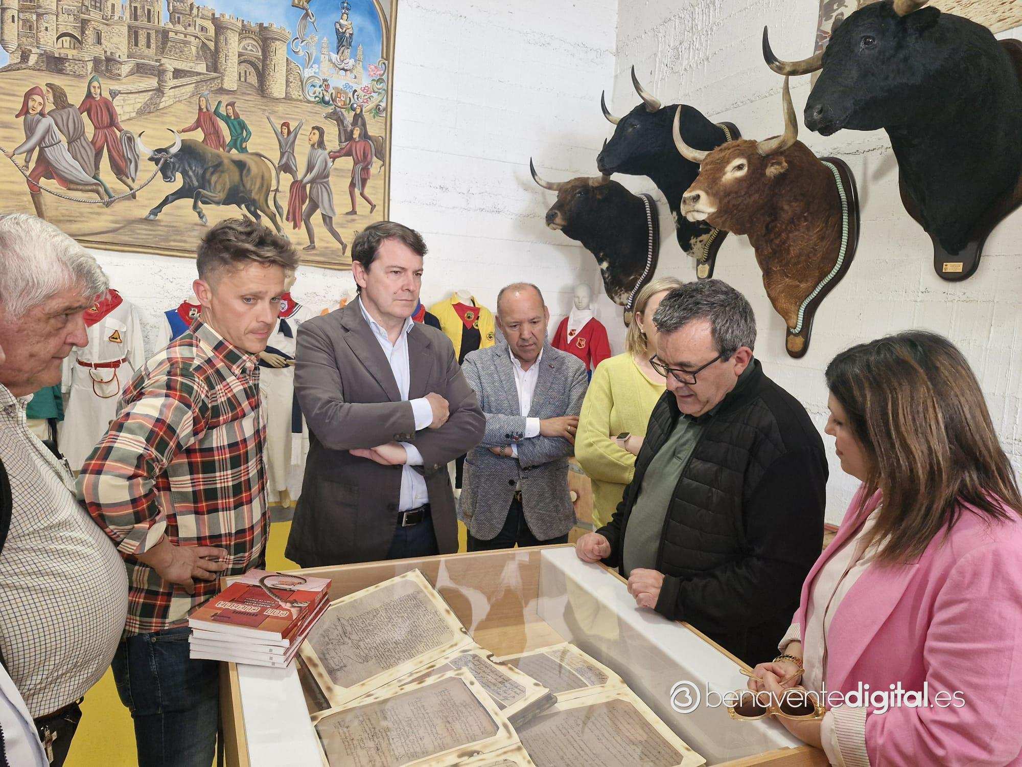 El recorrido continuó hasta la nueva exposición del Toro Enmaromado, ubicada en el antiguo Parque de Bomberos, anexo a la zona del Toril. Este museo, dedicado a la fiesta más importantes de Benavente, fue inaugurado simbólicamente con la firma de Mañueco en el libro de visitas como primer visitante oficial. Acompañado por el concejal de Fiestas, Alberto Lorenzo, y el archivero municipal, Juan Carlos de la Mata, el presidente recibió una visita guiada que incluyó una detallada explicación sobre la historia y las tradiciones del Toro Enmaromado.