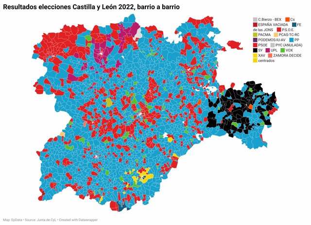 El PP fue primera fuerza en 1.973 secciones censales, seguido del PSOE, que lo fue en 1.151. El ascenso en estas elecciones de fuerzas regionalistas se nota también en el mapa: UPL ganó en 132 secciones y Soria ¡Ya! en 124, superando ambas a Vox, que fue primera fuerza en 89.