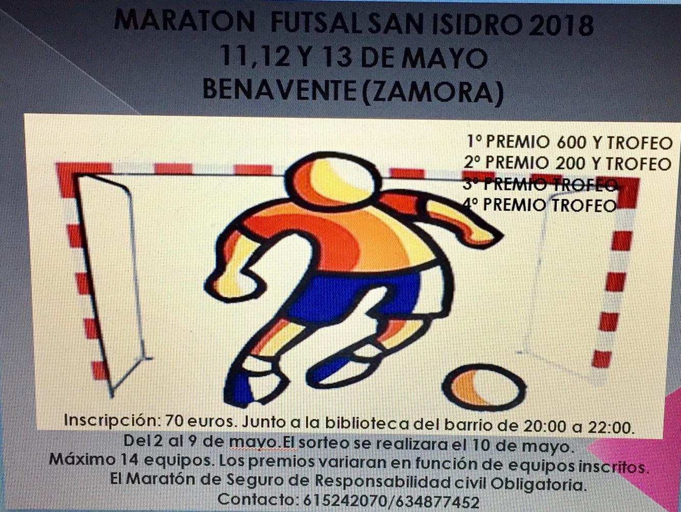 El barrio San Isidro de Benavente organiza un Maratón de Futsal para los días 11,12 y 13 de mayo. La inscripción tendrá un coste de 70 euros y se podrá realizar junto a la biblioteca del barrio de ocho a diez de la noche desde el 2 hasta el 9 de mayo.