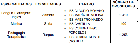 Por su parte, 1.256 personas realizarán las pruebas en Burgos para obtener una de las 68 plazas de Pedagogía Terapéutica; en Salamanca se darán cita 1.513 aspirantes para conseguir alguna de las 68 plazas de Educación Física; 494 opositores acudirán a Palencia para examinarse de Audición y Lenguaje y lograr una de las 30 plazas previstas; y, por último, 400 aspirantes se presentan a una de las 31 plazas de Música en Soria.