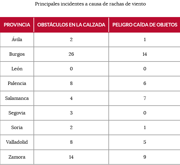 Por provincias, la de Burgos ha acumulado el mayor número de incidentes, un total de 42, seguida por las de Zamora, con 24 incidentes y Palencia, con 15 incidentes. El 1-1-2 ha dado aviso por 14 emergencias relacionadas con vientos y lluvias en las provincias de Salamanca y Valladolid, y por siete en la provincia de Ávila; y seis en la provincia de León, y tres en Segovia y Soria.