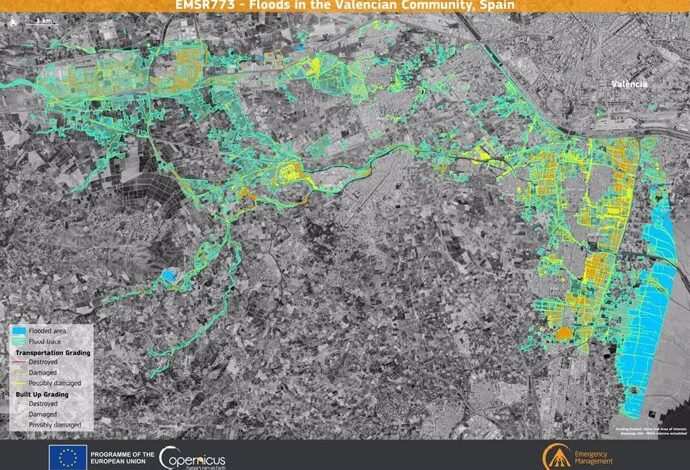 El servicio europeo ha encargado a Telespazio Ibérica, empresa especializada en geoinformación y navegación por satélite, la elaboración de mapas detallados de algunas de las zonas afectadas por el desastre.