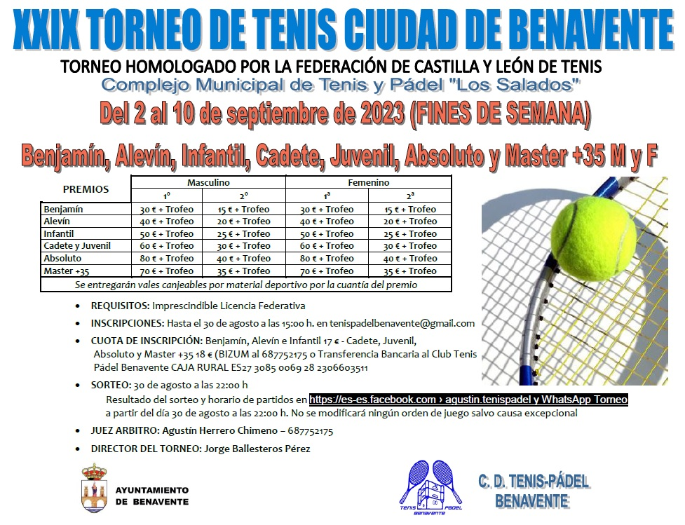 El CD Tenis-Pádel Benavente ha organizado el XXIX Torneo de Tenis Ciudad de Benavente que tendrá lugar del 2 al 10 de septiembre durante ambos fines de semana en el Complejo Municipal de Tenis y Pádel «Los Salados» con la participación de 50 deportistas de las diferentes categorías.