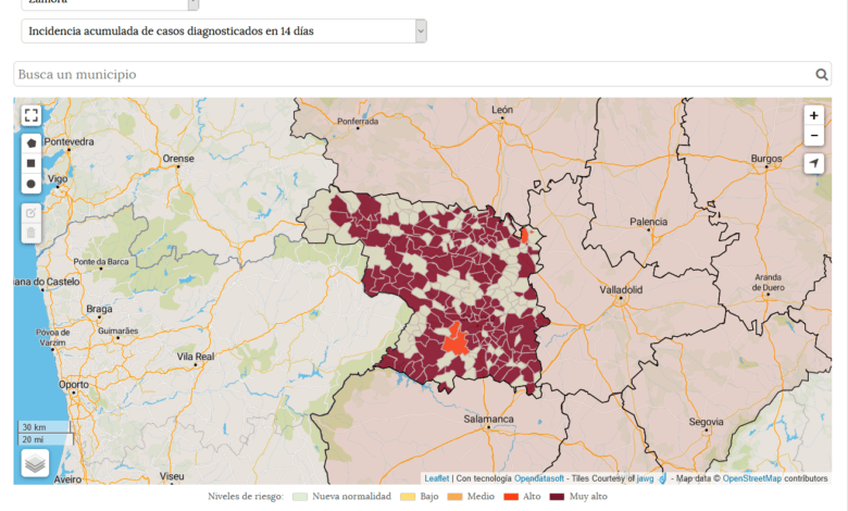 El portal de Datos Abiertos de la Junta de Castilla y León ha incorporado este viernes las cifras de los indicadores de riesgo de la pandemia del coronavirus en cada municipio, lo que apunta que los municipios de Burgos, Salamanca, Valladolid y Zamora presentan una incidencia acumulada en 14 días de más de 1.000 casos por cada 100.000 habitantes, lo que significa que más de uno de cada 100 habitantes se ha contagiado en las últimas dos semanas.