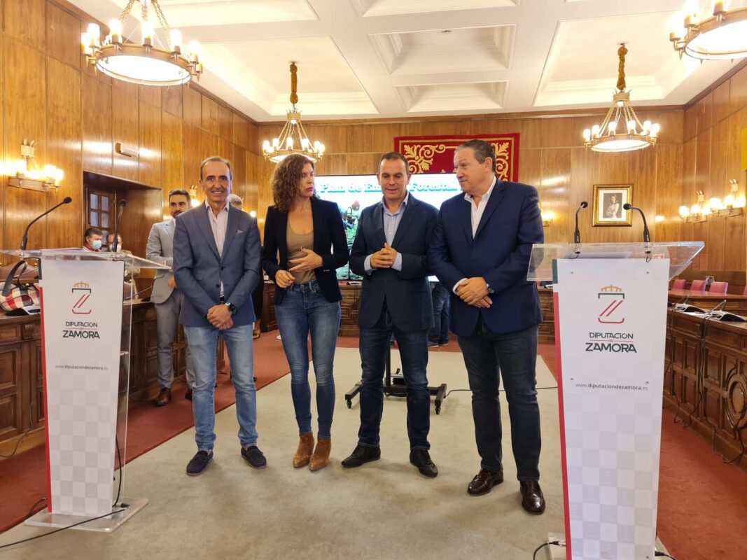 El presidente de la Diputación de Zamora, Francisco José Requejo Rodríguez, el diputado de Medio Ambiente y Obras Municipales, Javier Faúndez Domínguez, y la delegada territorial de la Junta, Clara San Damián, presentaron esta mañana el Plan de Empleo Forestal ELMET 2022 con el que se ha procedido a contratar a medio centenar de trabajadores demandantes de empleo.