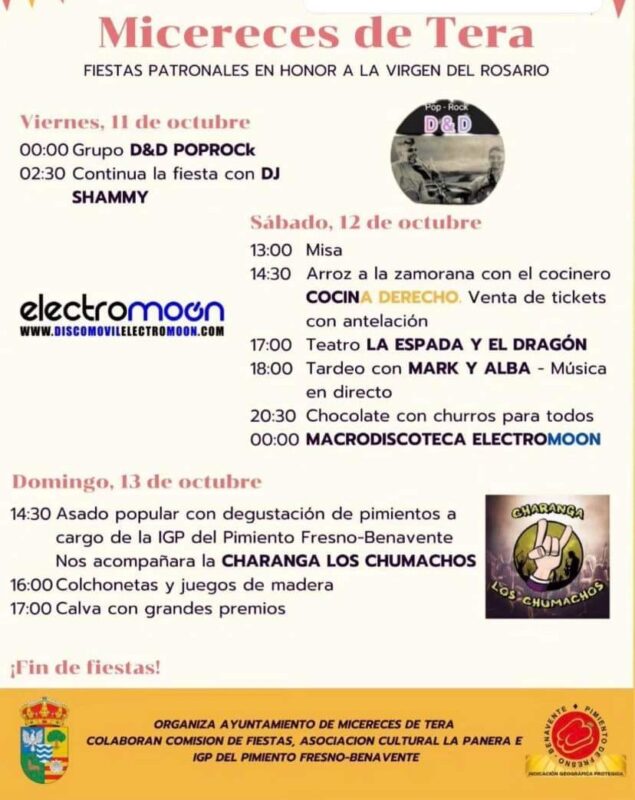 El abanico programático de las fiestas, organizado por el Ayuntamiento, la Comisión, la asociación cultural «la Panera» y la IGP pimiento Fresno-Benavente, se abre el viernes 11 con una sesión de bailes y ya el sábado 12 se celebra la misa y procesión con la Señora del Rosario y se comparte una comida a base de arroz a la zamorana. Por la tarde está prevista la representación escénica de «la espada y el dragón», la actuación musical de Mark y Alba, la degustación de una chocolatada con churros y la verbena con la macrodiscoteca Electromoon.