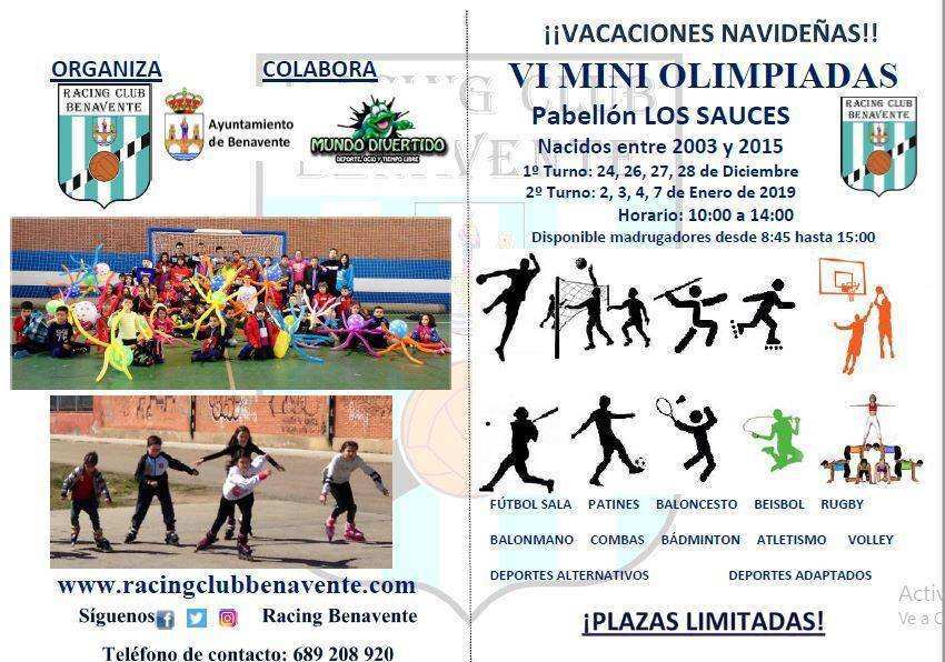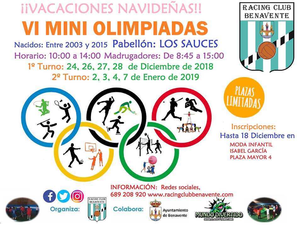Llegando las fiestas navideñas el Racing Club Benavente vuelve a la carga con la celebración de unas nuevas Mini Olimpiadas. Ya es la sexta edición que el club benaventano saca adelante estos deportes de ocio con los que los pequeños de entre 3 y 15 años puedan entretenerse además de practicar otros deportes diferentes o no tan diferentes.