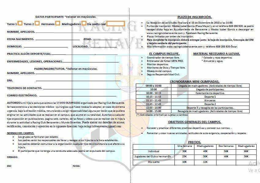 Fútbol sala, patines, baloncesto, béisbol, rugby, balonmano, combas, bádminton, atletismo, voleibol junto con deportes adaptados y deportes alternativos completarán la demanda de aquellos que acudan a este nuevo evento del Racing Club Benavente que contarán con el modelo de madrugadores en horario de 8,45 horas y 14,00 horas. Las jornadas, que serán a lo largo de la mañana, comenzarán a las 10,00 horas y finalizarán a las 14,00 horas. El plaza de inscripción será hasta el martes 18.
