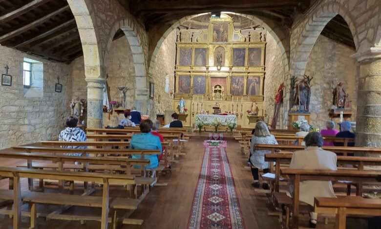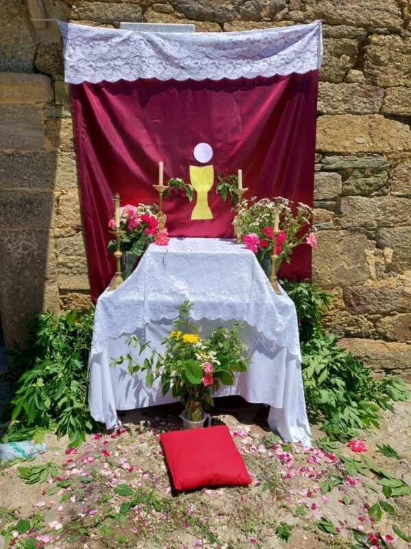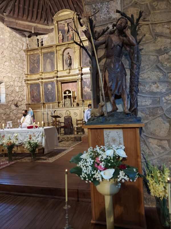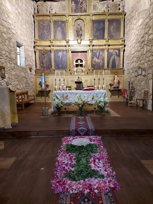 En esta jornada festiva del 24 de junio, la iglesia se engalanaba para rendir tributo al copatrón en el templo parroquial dedicado a San Millán y que recoge también la devoción a San Juan Bautista representado en una esbelta imagen. Si los conjuntos florales se prodigaban en el templo, no podía faltar una alfombra de flores para el acceso al presbiterio y la imagen del copatrón.