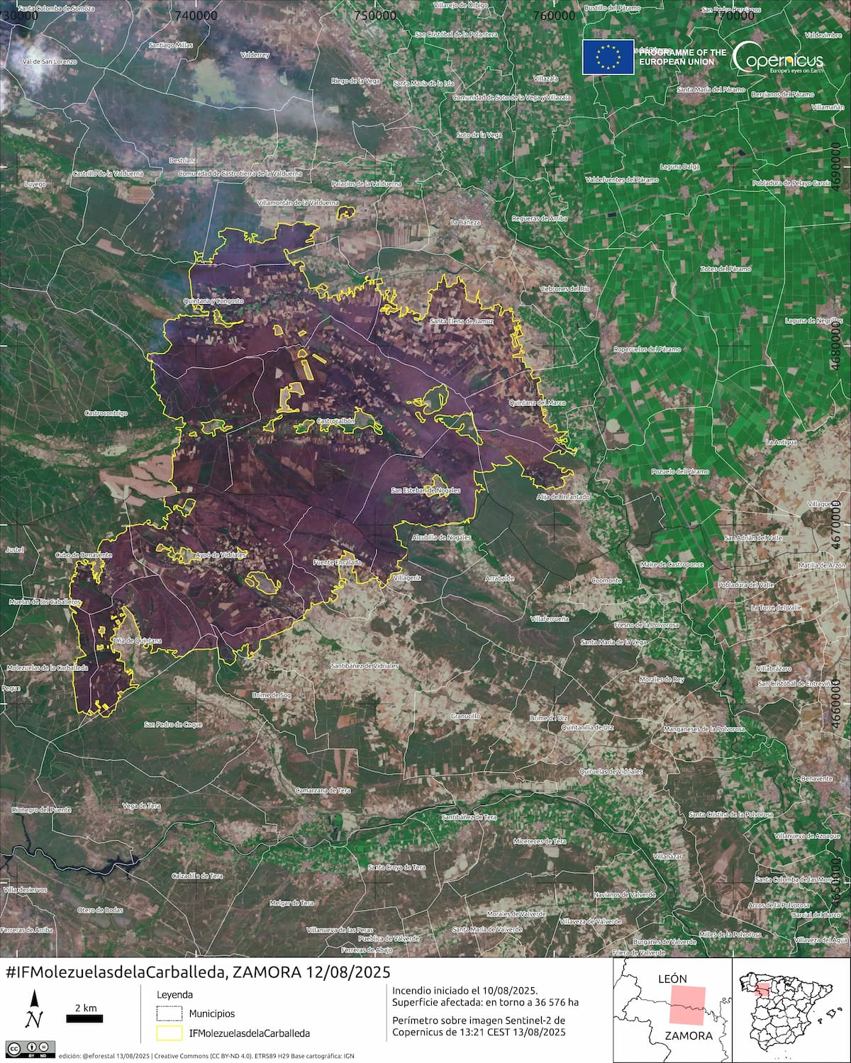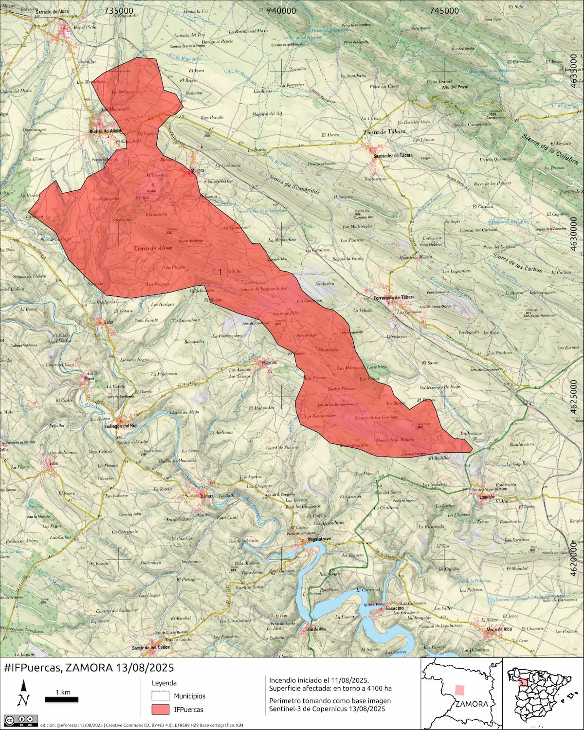 Los incendios de Molezuelas de la Carballeda y Puercas continúan activos y suman ya entre 33.000 y 41.000 hectáreas calcinadas, según estimaciones basadas en datos del programa europeo Copernicus y cálculos de expertos forestales.